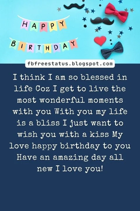 I think I am so blessed in life Coz I get to live the most wonderful moments with you With you my life is a bliss I just want to wish you with a kiss My love happy birthday to you Have an amazing day all new I love you!
