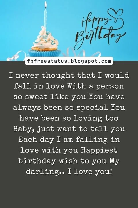 I never thought that I would fall in love With a person so sweet like you You have always been so special You have been so loving too Baby, just want to tell you Each day I am falling in love with you Happiest birthday wish to you My darling.. I love you!